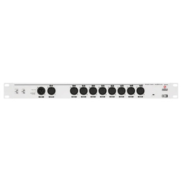 1 in to 8 out DMX/RDM optosplitter / data-fixer with Neutrik XLR5 connectors. It is designed to sit in a 1U slot in a 19″ rack, with the added bonus that is is only 50mm deep.
