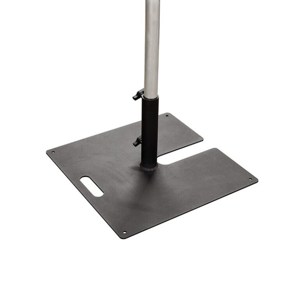 The industry standard. The Doughty Tank Trap provides the means to support a 48mm vertical tube or scaffold pole and is ideal for side lighting. Consists of a 600mm square steel plate with a 48mm receiver welded to it. There is a cut out in the base to allow compact stacking for transport and storage.